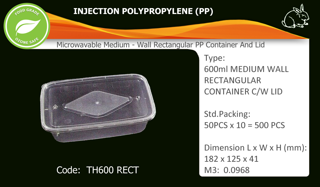 600ml Medium Wall Rect.Cont. c/w LidCode: TH600 RECT