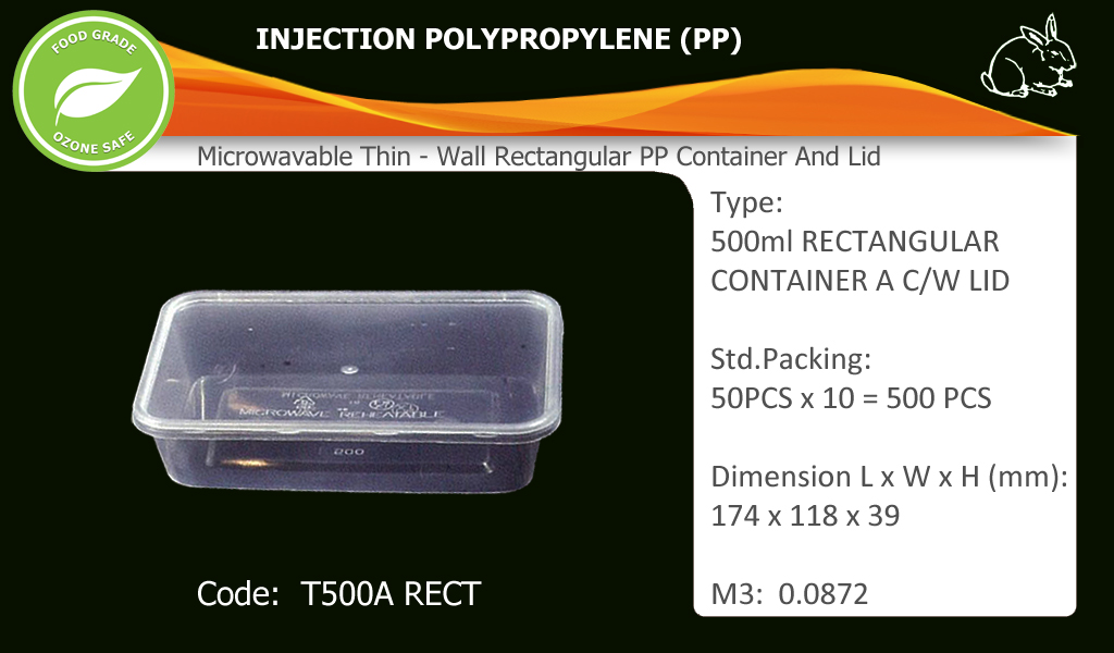 500ml Rectangular Container c/w LidCode: T500 RECT